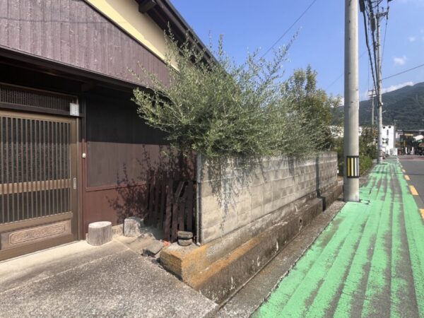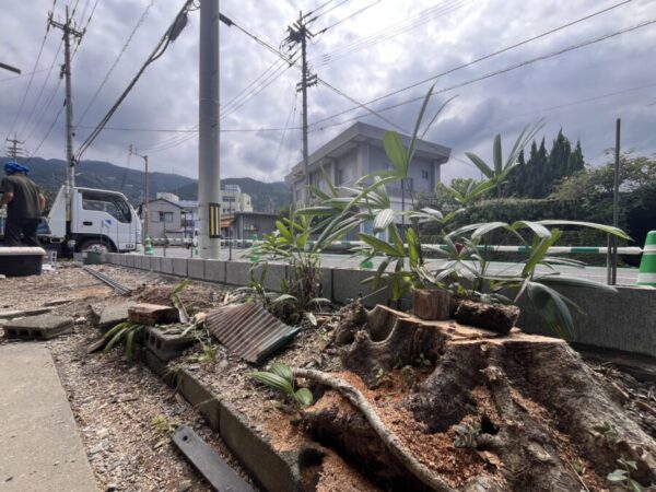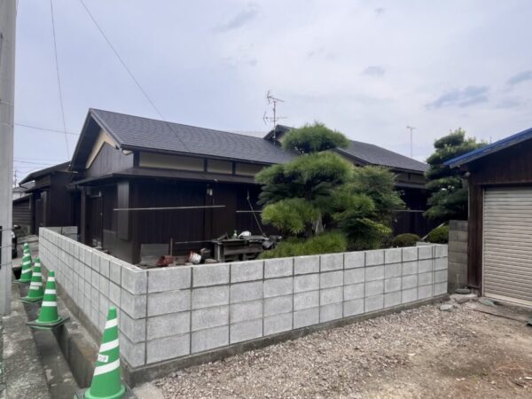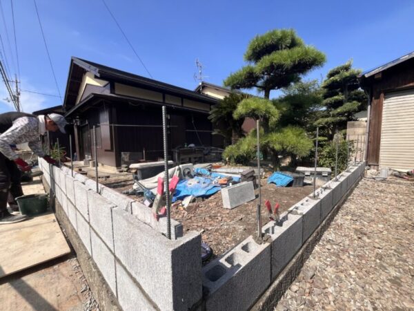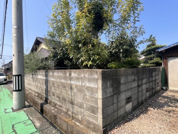 ブロック塀に亀裂が入り倒壊の恐れがあるので何とかしてほしいと相談がありました。 植栽の木の根が太くなりブロック塀を押した事による亀裂だと判明したので 庭木とブロックを解体して目隠しフェンスを設置しました。 まず、ブロック際の植栽を全て根元でカットして、切り株の断面にインパクトドリルで数ヶ所穴を開け 根枯らし剤を注入しました。 重機を入れて根を全て掘り起こす事をお薦めしましたが、そうすると基礎まで壊してしまう可能性があるので 出来るだけコストを抑えてほしいとの要望でしたので今回は伐採に留めさせていただきました。 そして伐採した後はブロック塀も解体しました。 全て解体後、亀裂が入っていた基礎の補修をして、ブロックを4段積み800のフェンスを設置して完了しました。 元々は6段積みの1200の高さのブロック塀でしたが、目隠し代わりなっていた植栽を伐採したので フェンスを設置して1600の高さに調整しました。