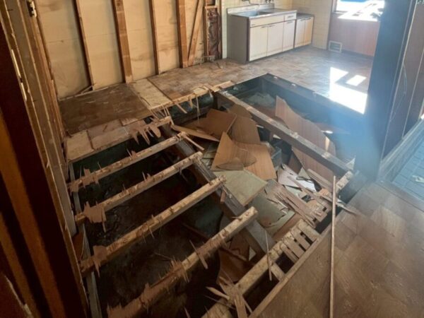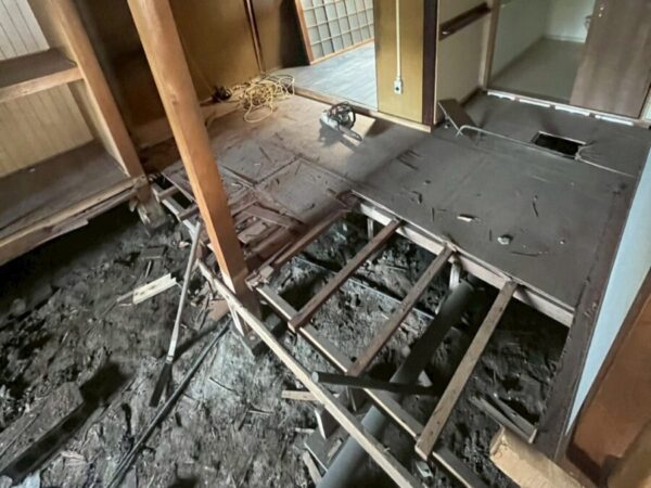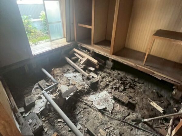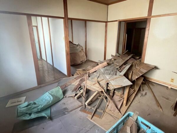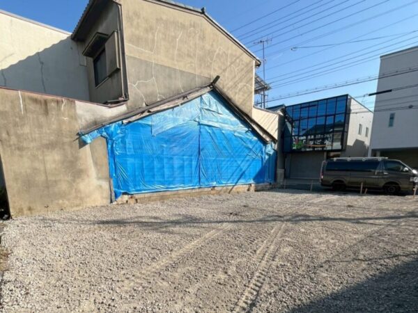 切り離した壁は後日外壁補修予定なので、雨が入らないようにブルーシートで対応しました。