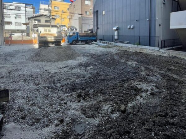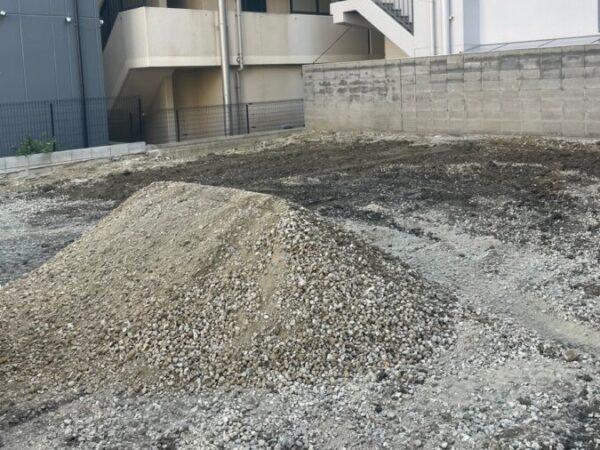 駐車場で車を入れるので土が見えないように厚めに砕石を4tダンプで8回運び入れております。