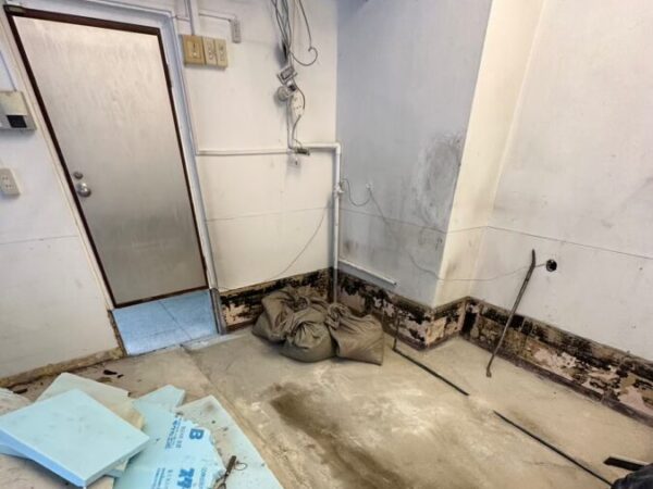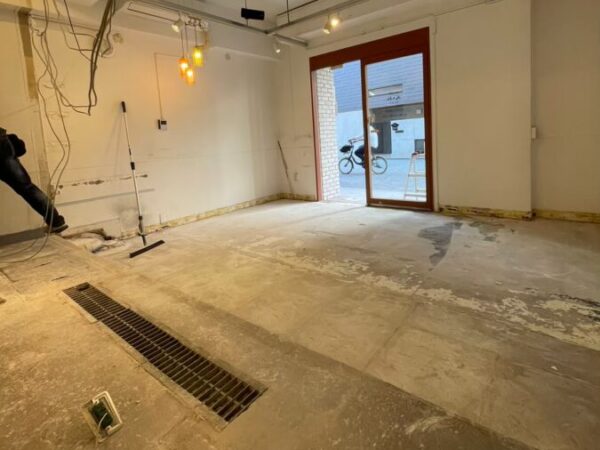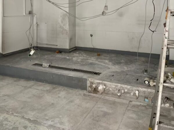 厨房什器撤去、間仕切撤去、カウンター等を全て取り外した後、コンクリート土間の立ち上がりを削りました。
