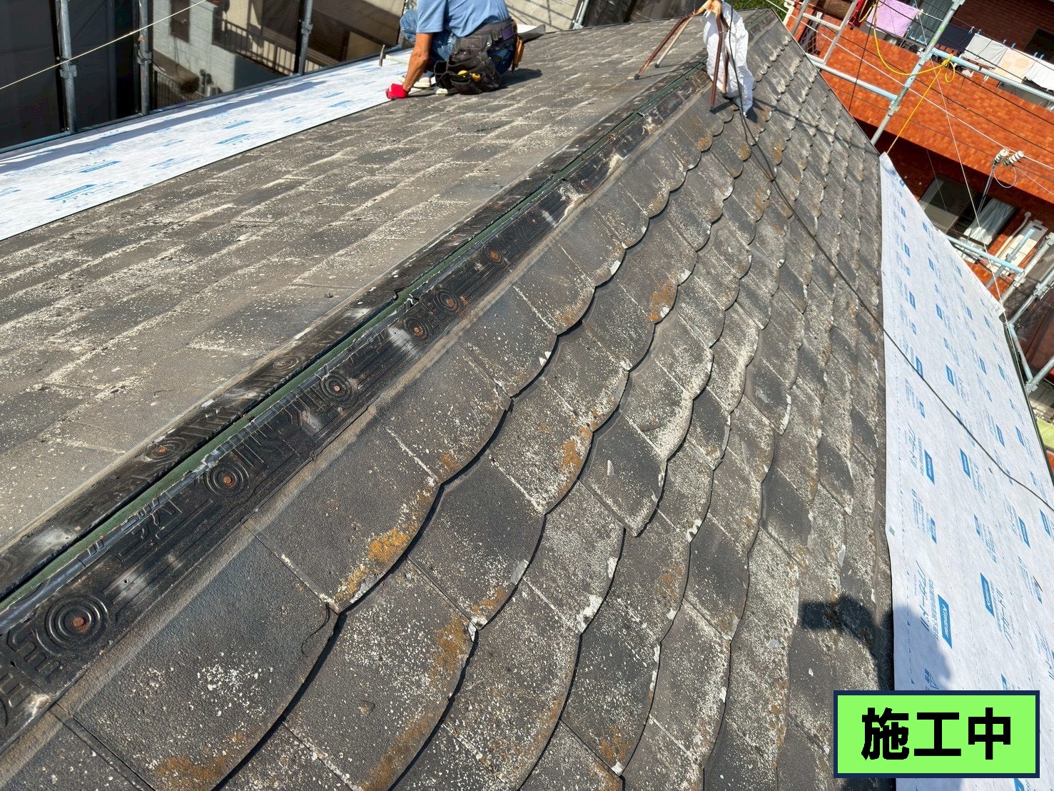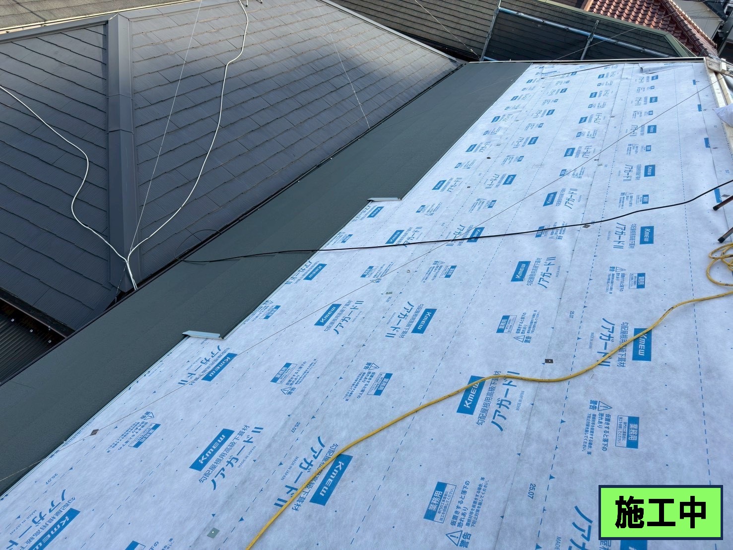 谷の交換を行うため、両サイドの瓦をめくり、ルーフィングを引き(防水紙)
