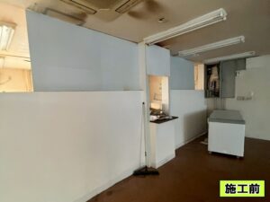 看板のシート剥がし、土間ハツリ、間仕切り壁撤去、換気ダクト撤去、換気扇撤去、厨房機器残置物撤去、木造作棚。