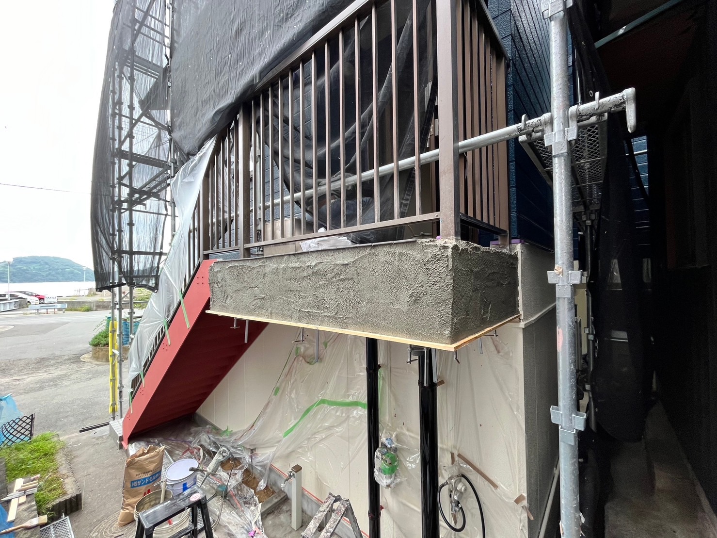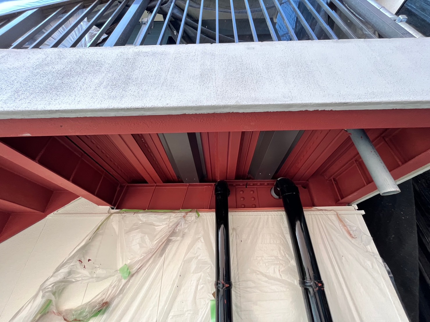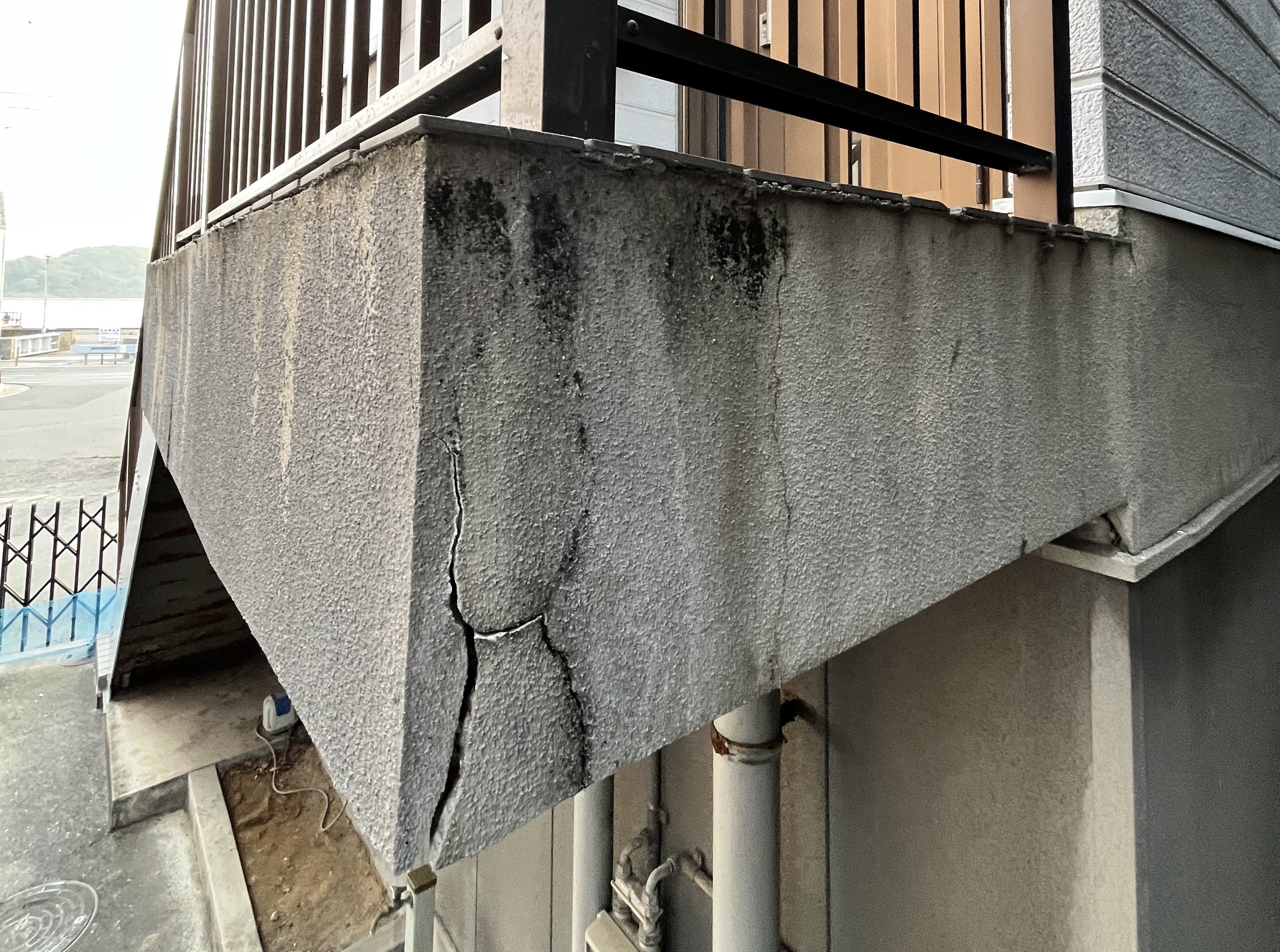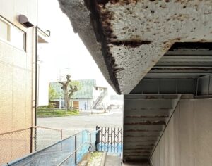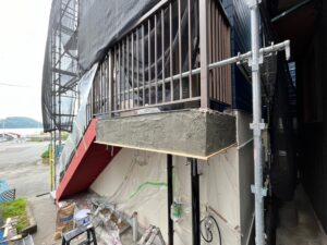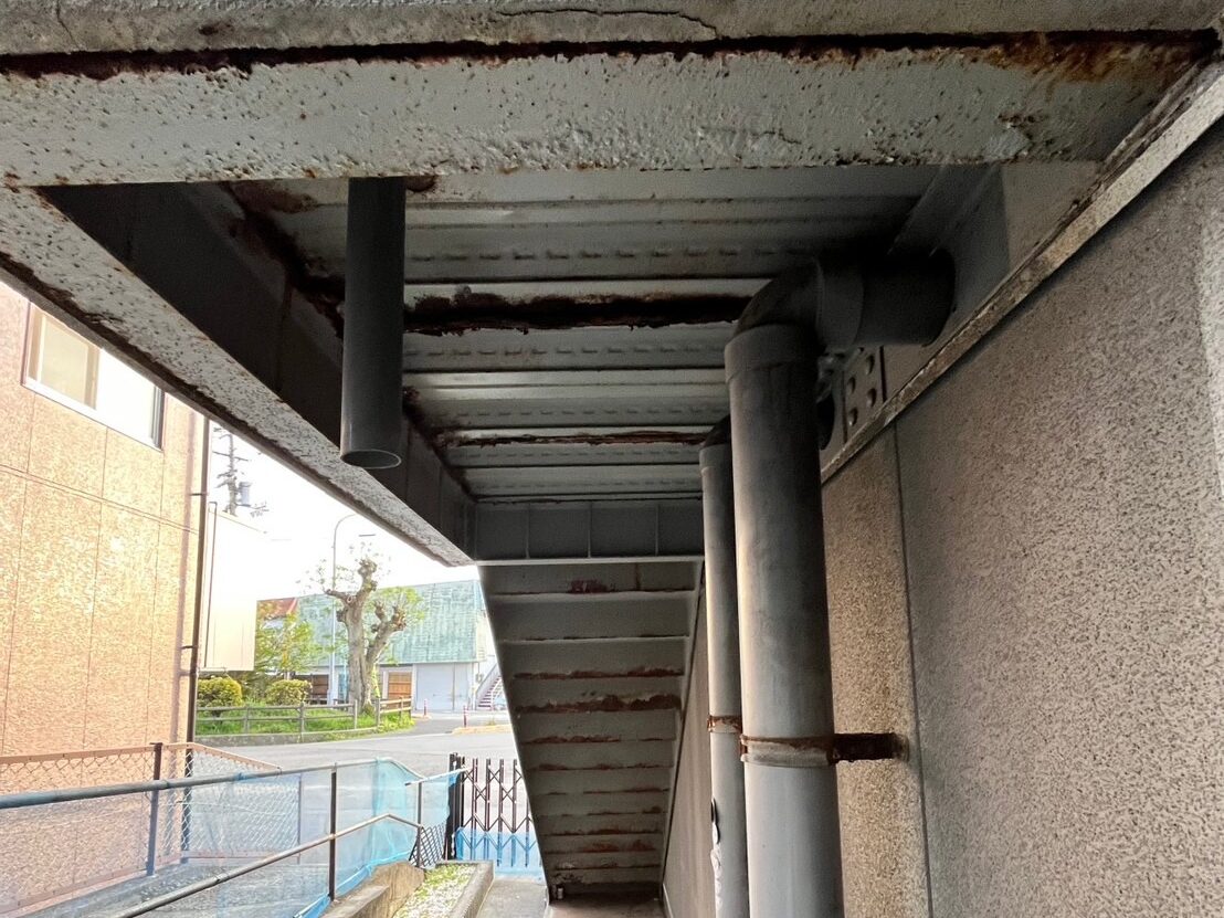排水ドレーンが詰まって下地の鉄骨は腐敗し、モルタルは爆裂していました。