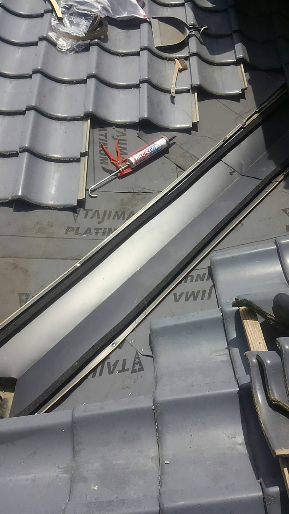 雨漏りしていた板金部分も板金周りの瓦をめくり土を取り、防水シートを貼って、新しい板金を貼りシルガードを乗せ瓦を葺きました。