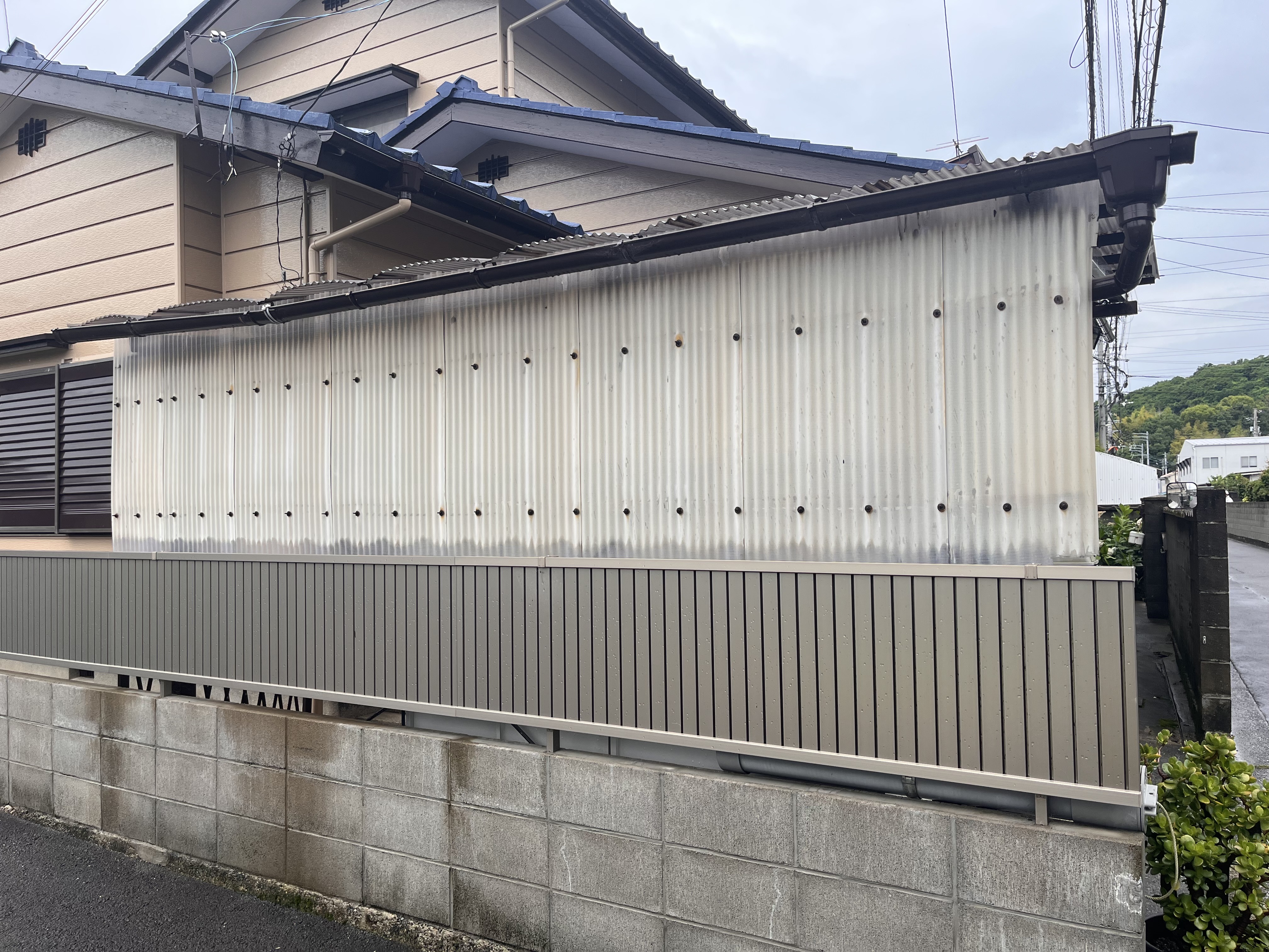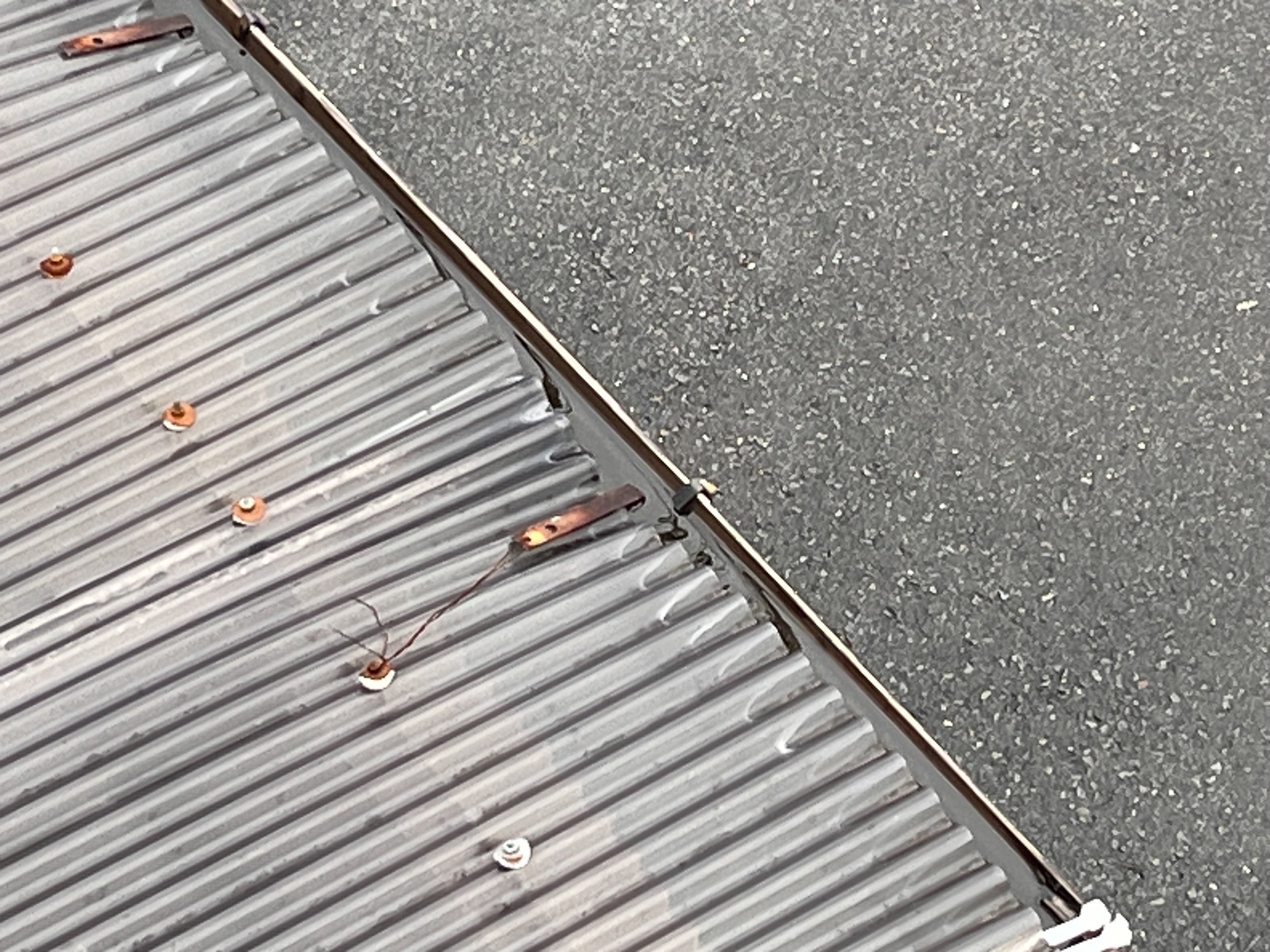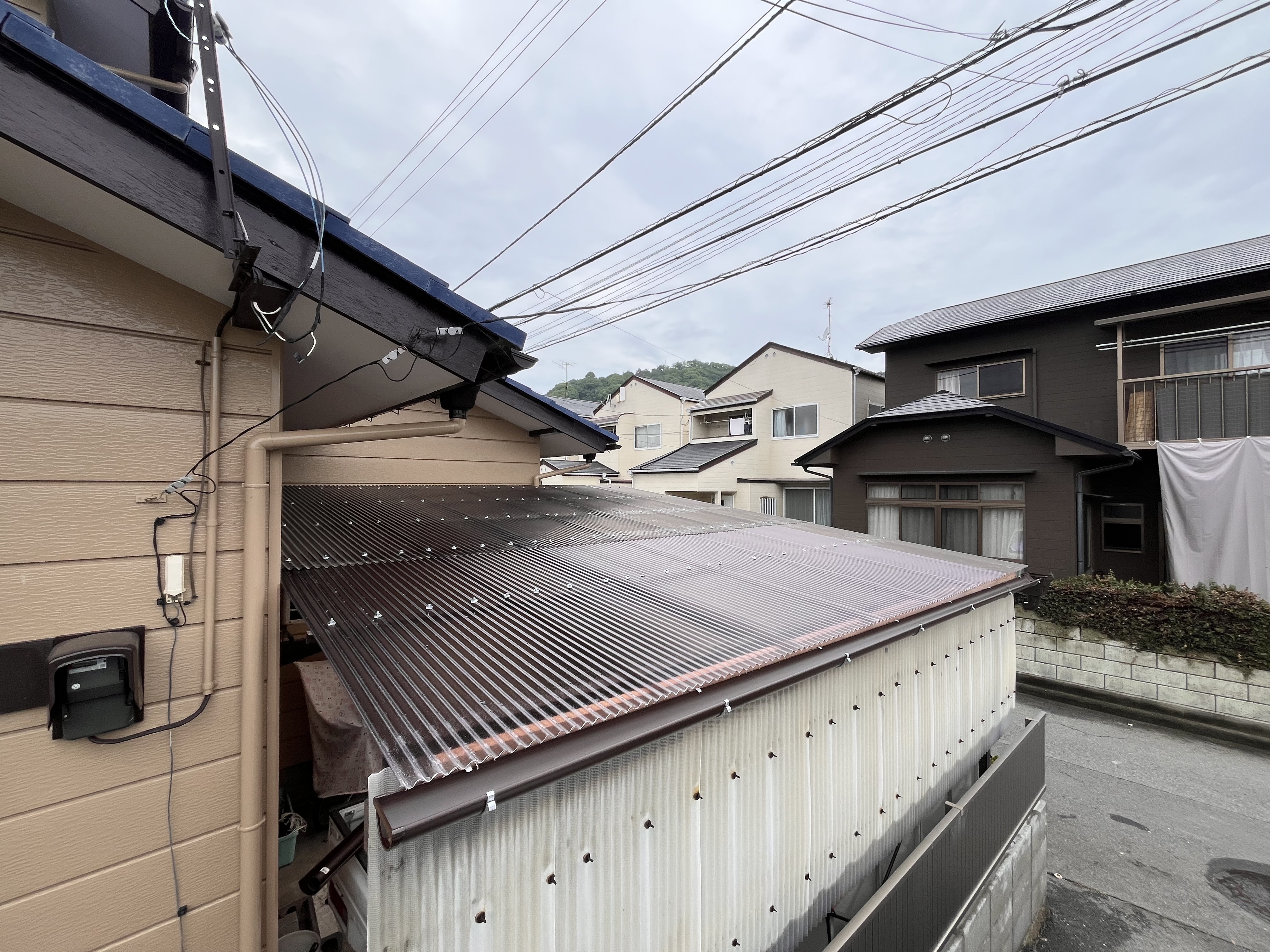 カーポートの外壁の波トタンが錆びて剥がれ、納屋の木製の開き戸が壊れて雨漏りしていました。