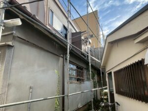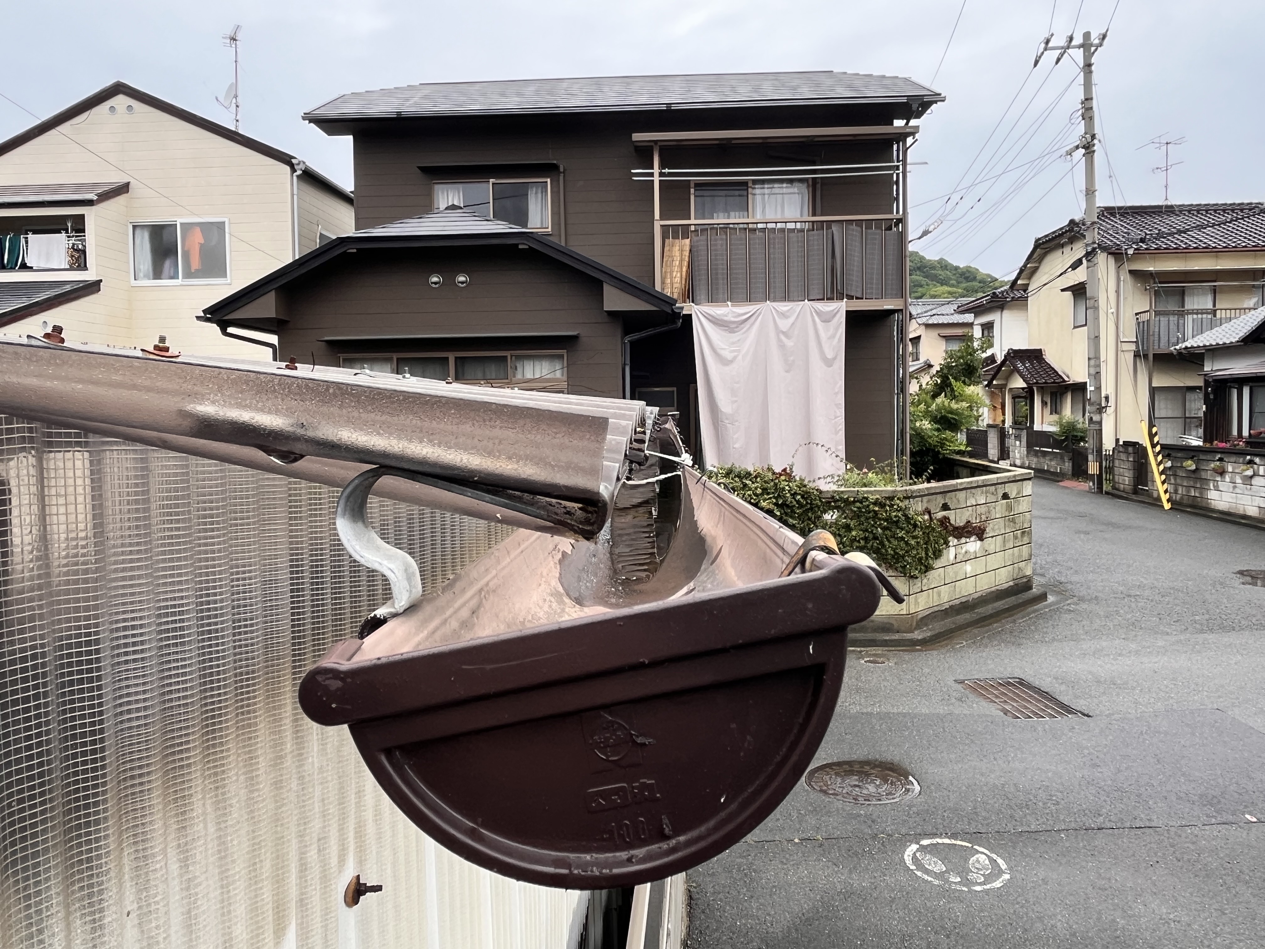 現場は総二階の戸建てでしたので、ステージ足場を組んで破損した部分の樋交換をしました。