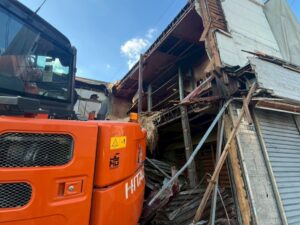 足場組みから組み始め、重機で正面から崩し二階、壁と順番に取毀していきました。