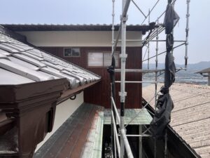 現場は総二階の戸建てでしたので、ステージ足場を組んで破損した部分の樋交換をしました。
