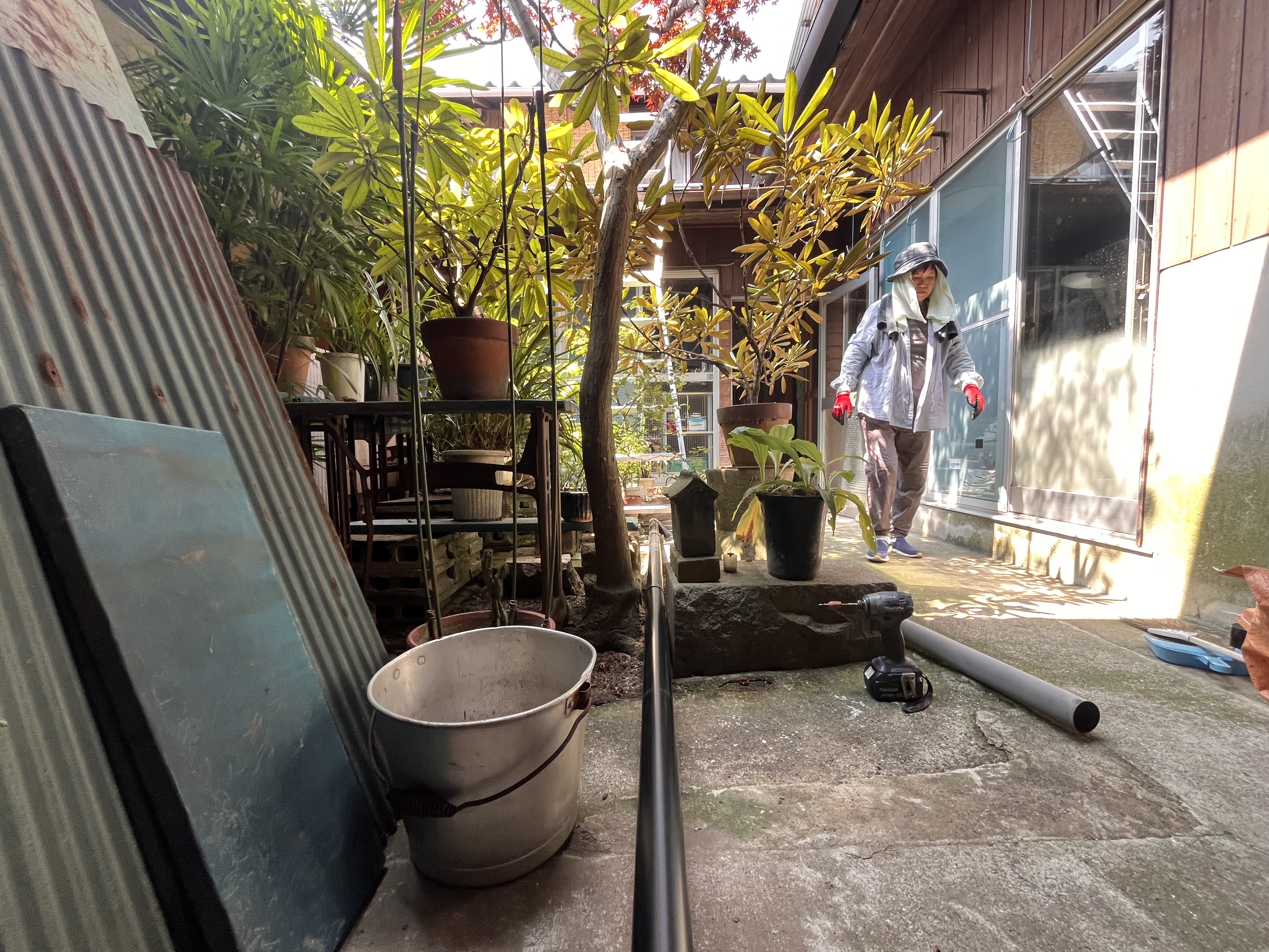 雨量の多い時は容量を受けきれないと判断し、大型の角樋に交換しました。