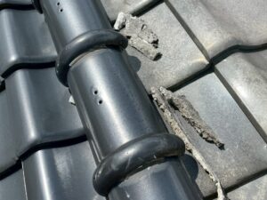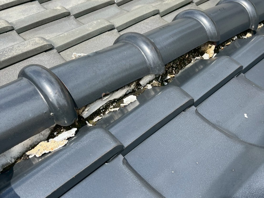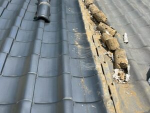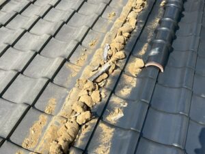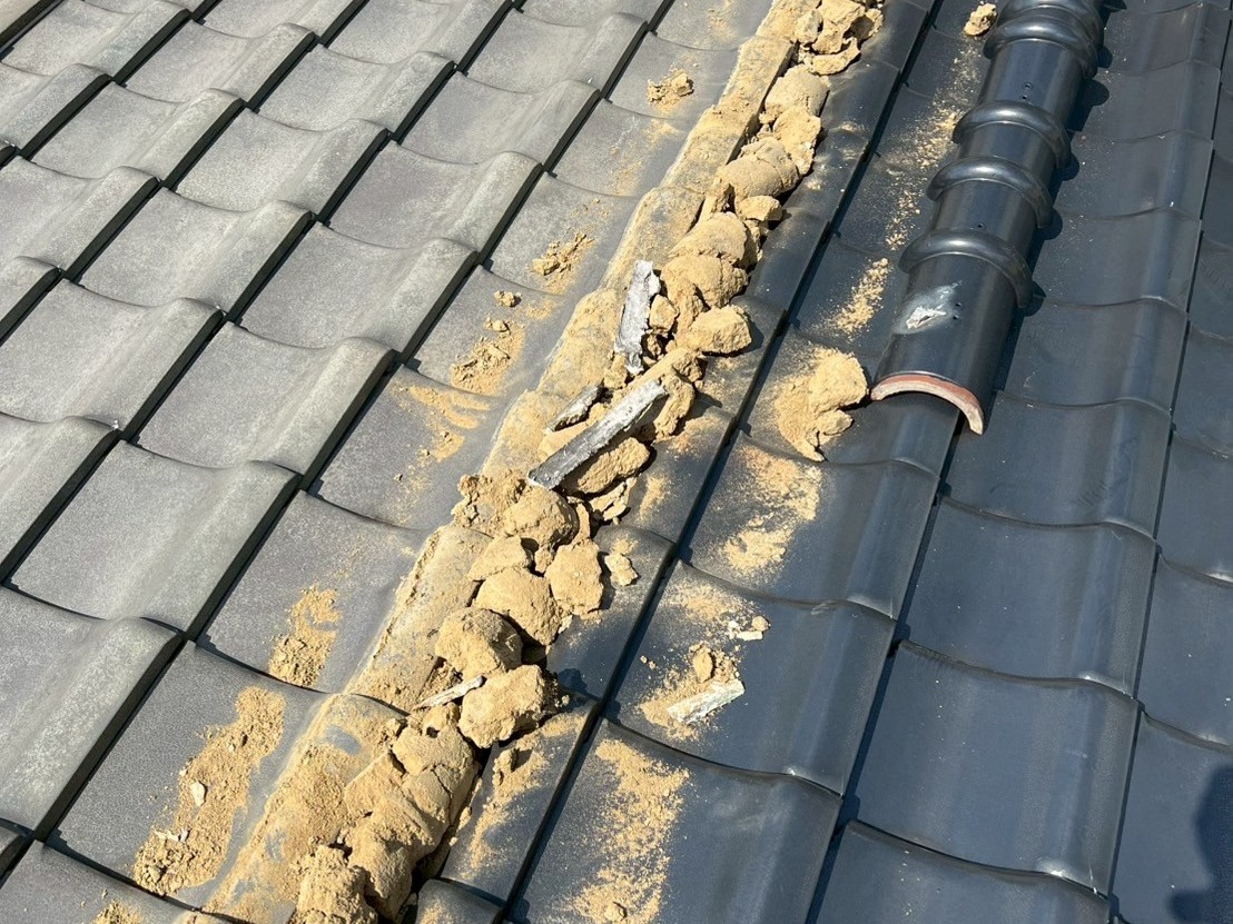 屋根の棟の部分の工事で棟土取り除き新たに土台漆喰を塗り、積み直しました。