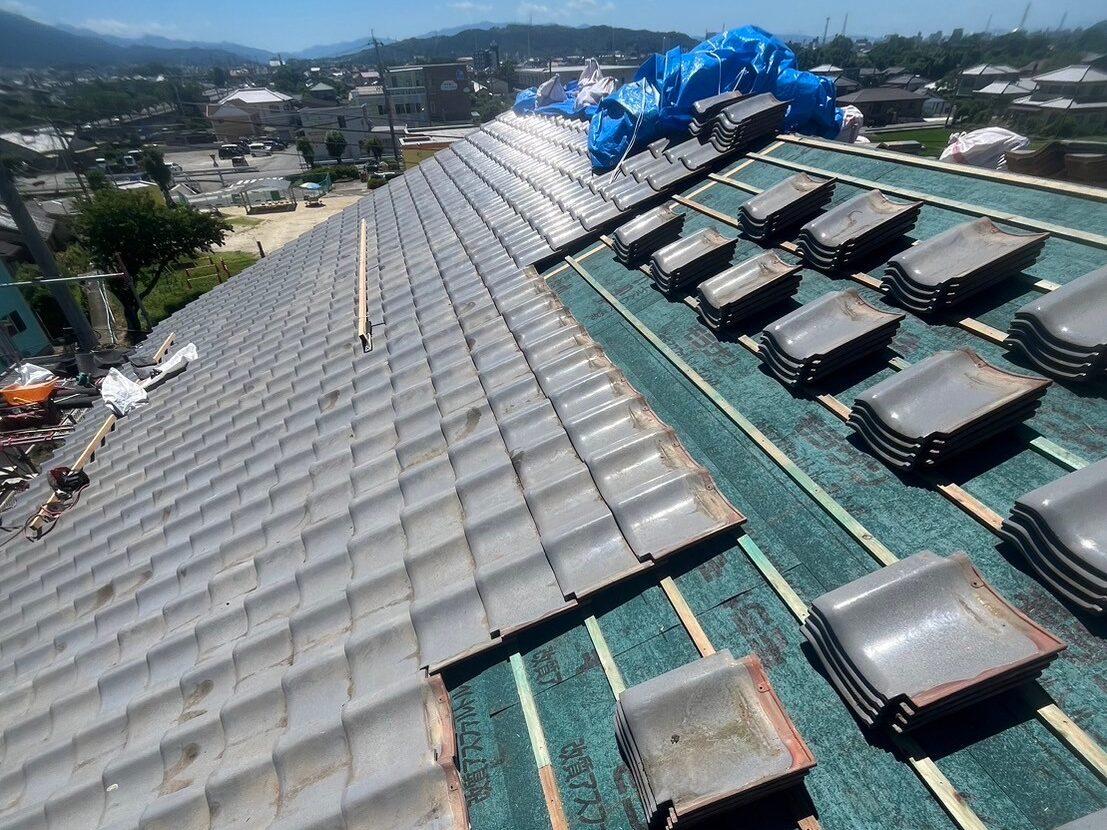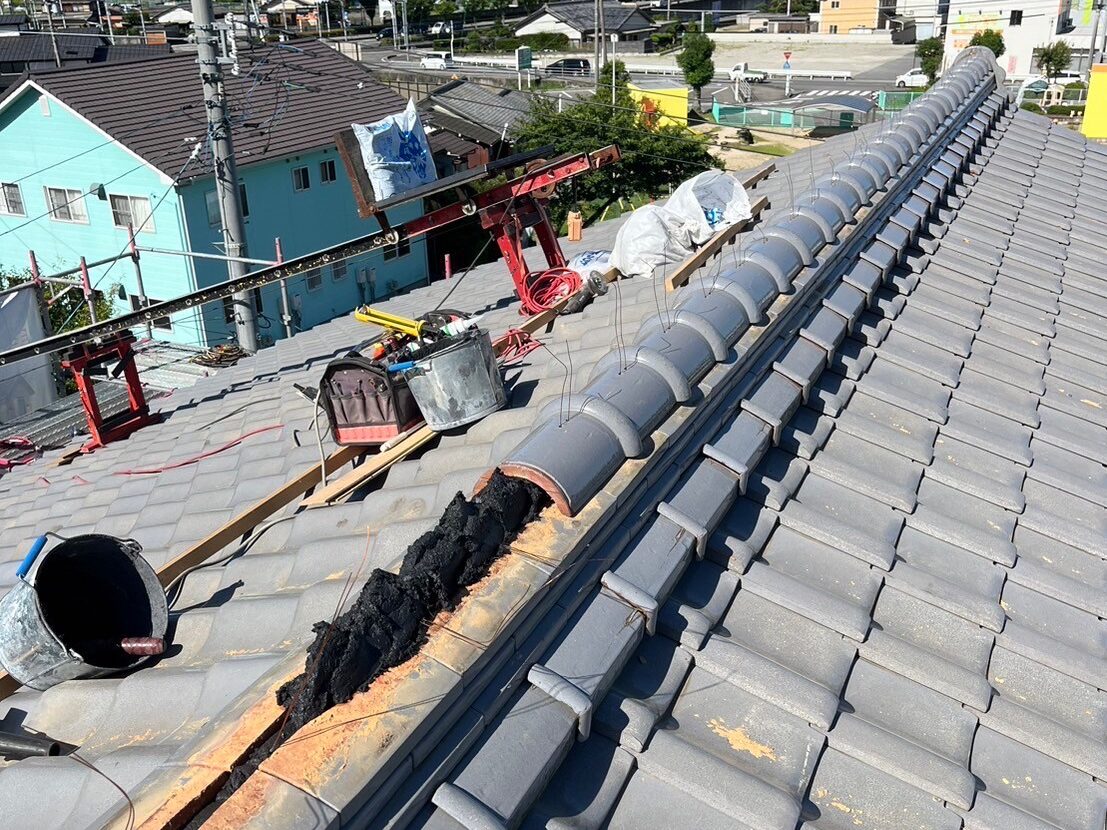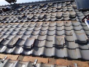 出来るだけ安くと言うお客様のご要望でしたので、雨漏り箇所の瓦を捲って防水シート(ルーフィング)の張り替えをして、既存の瓦を元に戻し、棟は新規の強化棟を施工しました。