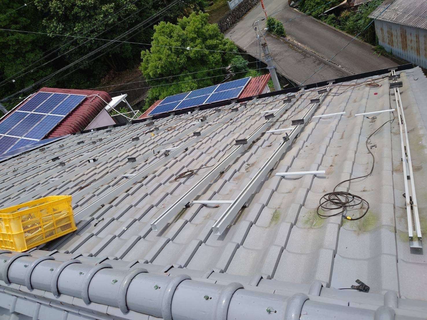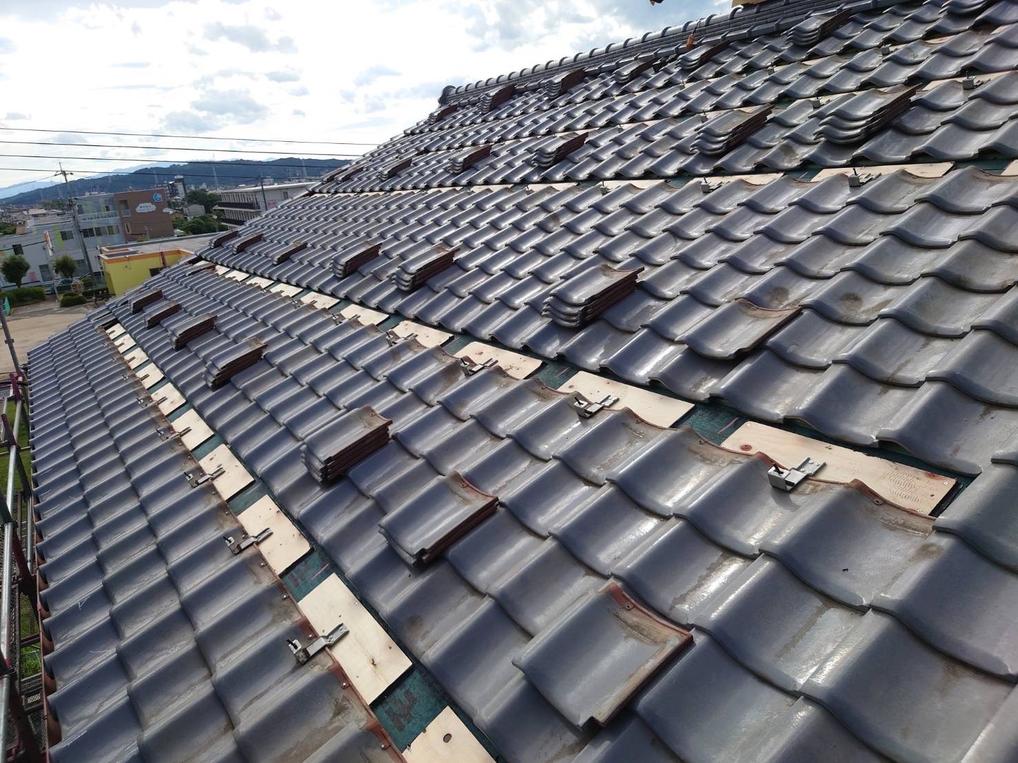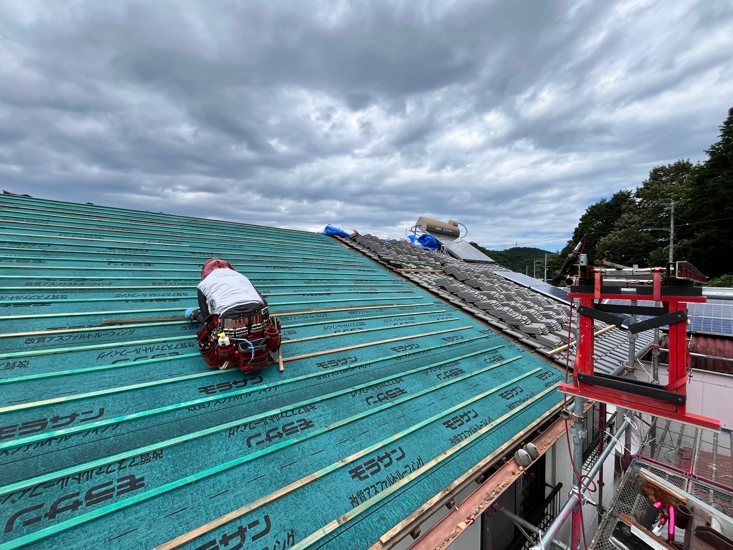 既設の太陽光パネルと瓦を一時的に撤去して、